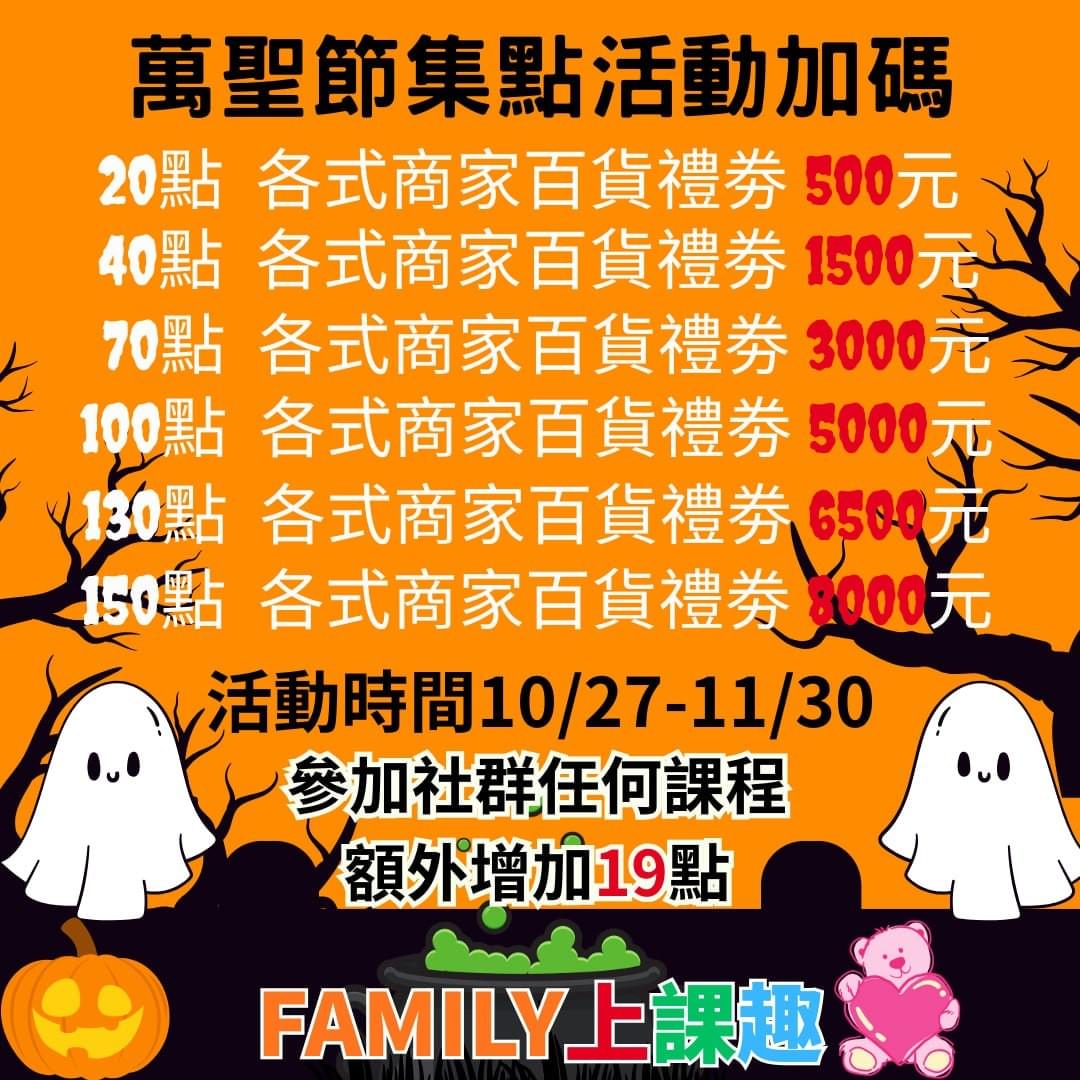 萬聖節不只要變裝,也要「集點拿好禮」!✨【FAMILY遊樂趣】準備了超值加碼活動,讓你上課、玩樂、集點一次滿足~